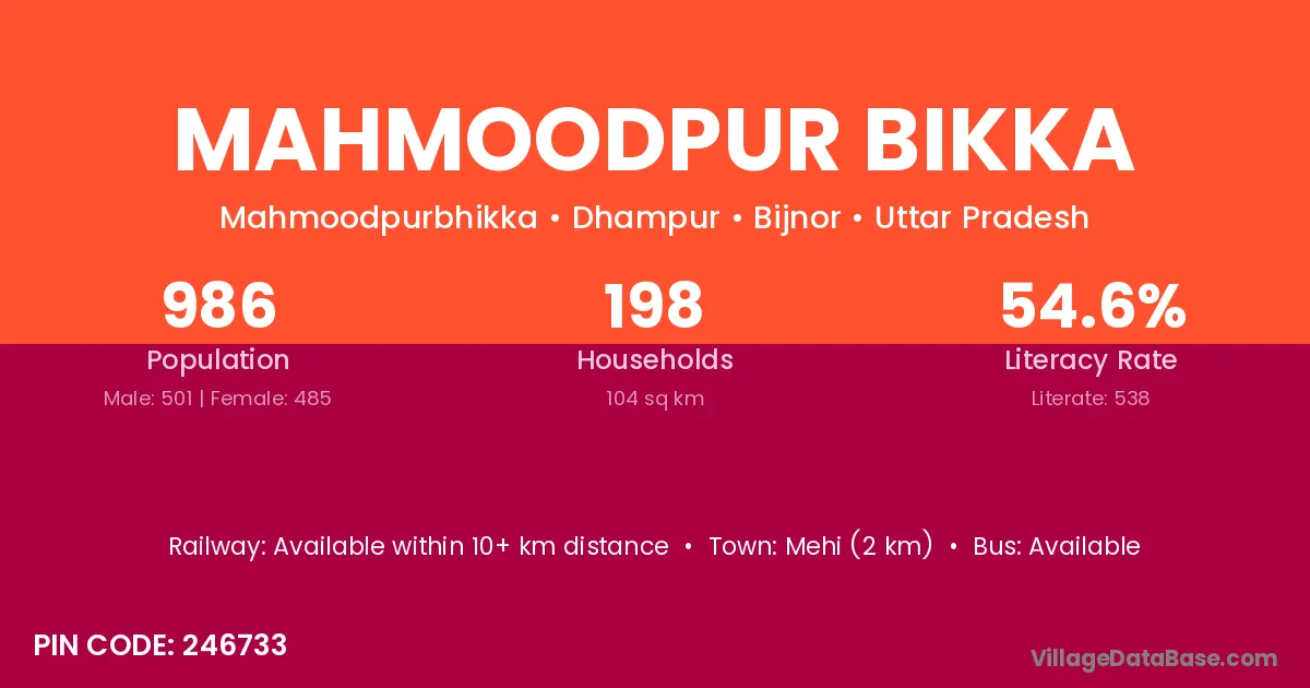 Mahmoodpur Bikka village has a total population of 986 people, of which 501 are males and 485 are females.