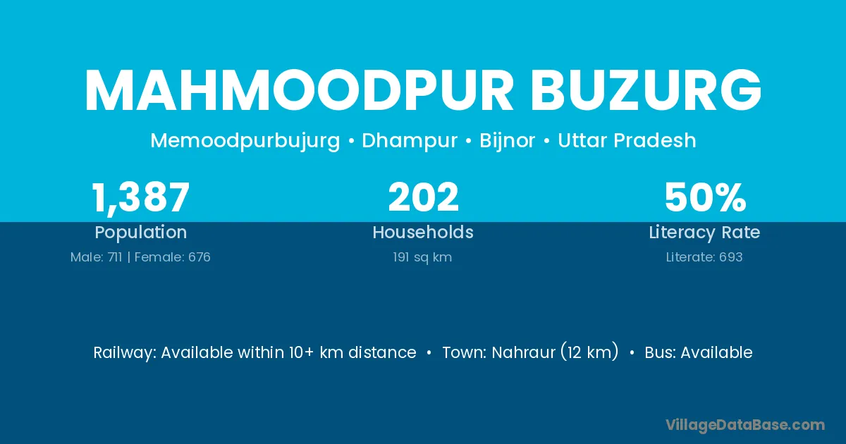 Mahmoodpur Buzurg village has a total population of 1,387 people, of which 711 are males and 676 are females.