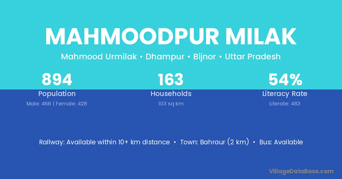 Bahraur (2 km) is the nearest town to Mahmoodpur Milak village for major economic activities and is located approximately 2 km away.