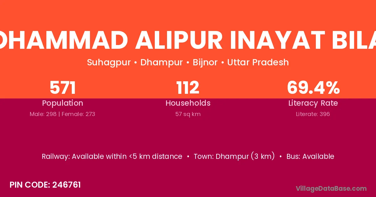 Dhampur (3 km) is the nearest town to Mohammad Alipur Inayat Bila A village for major economic activities and is located approximately 3 km away.