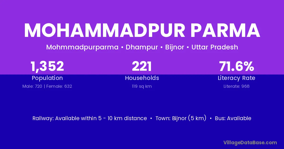 Bijnor (5 km) is the nearest town to Mohammadpur Parma village for major economic activities and is located approximately 5 km away.
