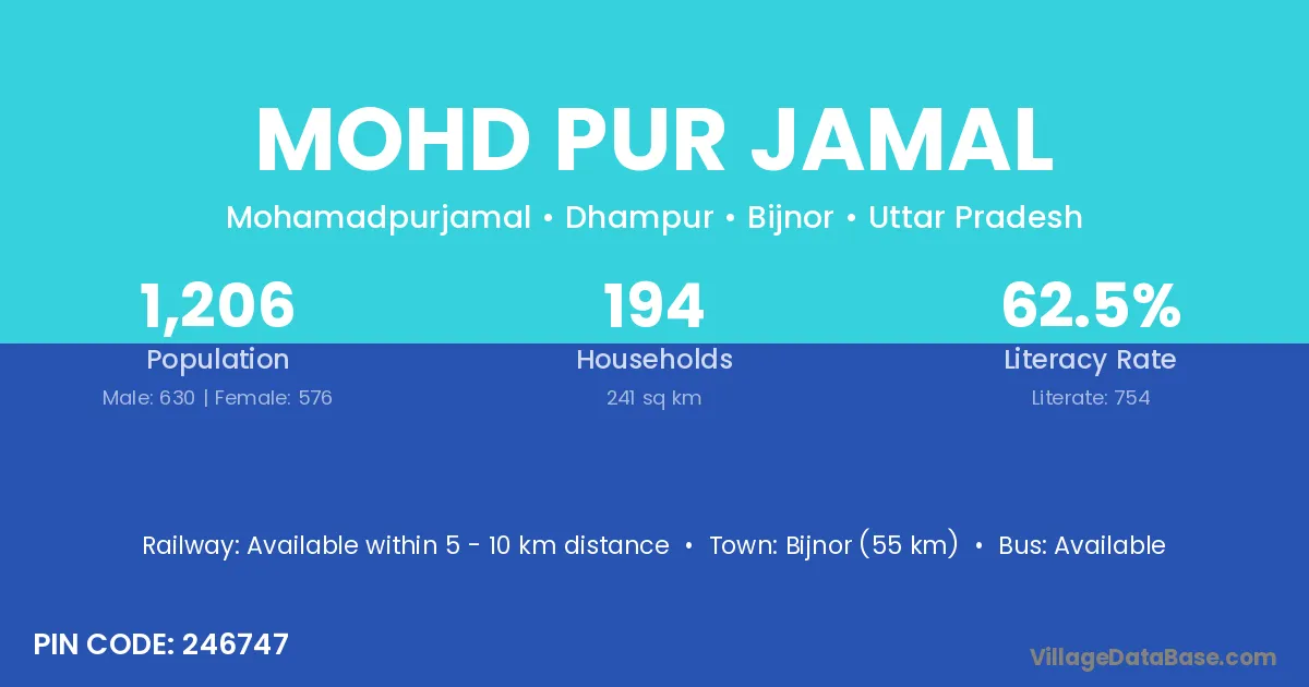 Bijnor (55 km) is the nearest town to Mohd Pur Jamal village for major economic activities and is located approximately 55 km away.