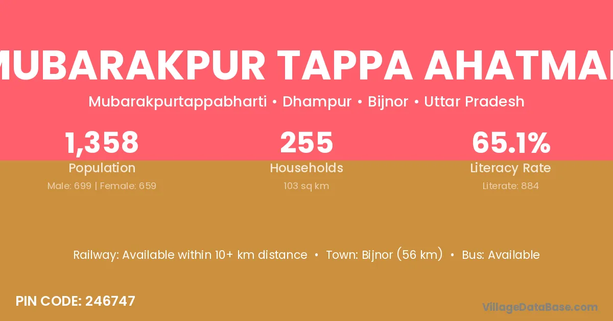 Bijnor (56 km) is the nearest town to Mubarakpur Tappa Ahatmali village for major economic activities and is located approximately 56 km away.