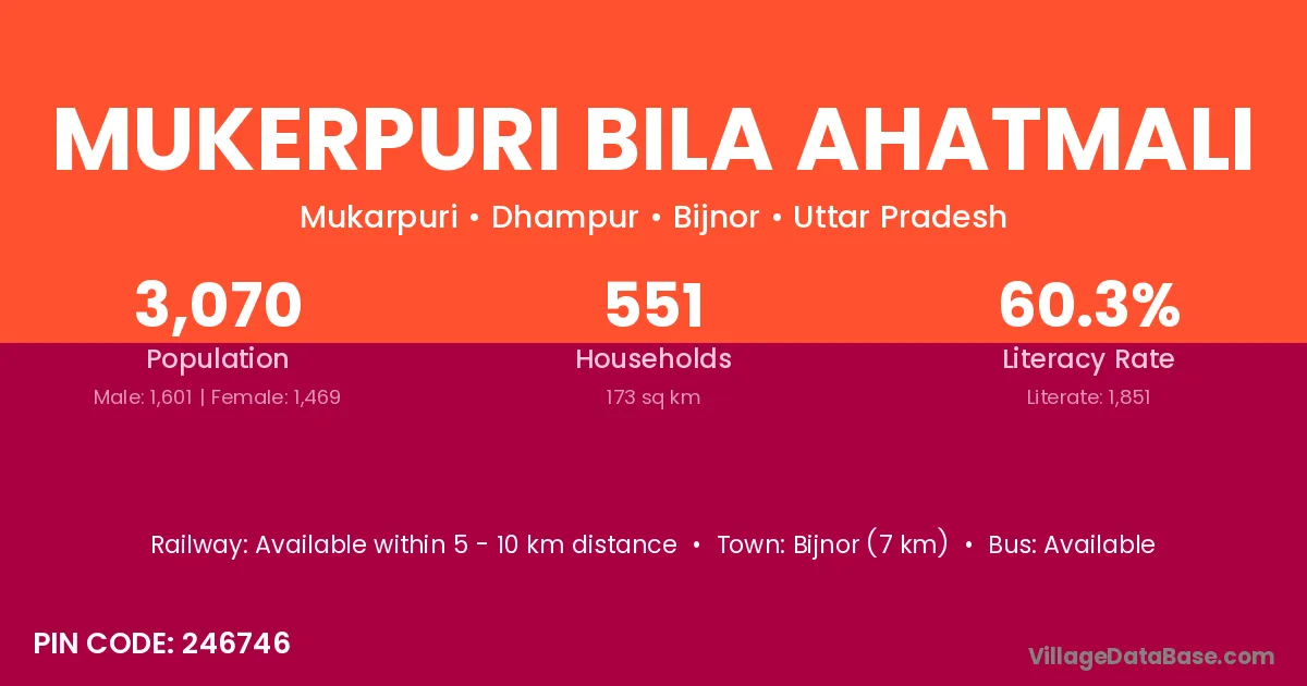 Bijnor (7 km) is the nearest town to Mukerpuri Bila Ahatmali village for major economic activities and is located approximately 7 km away.