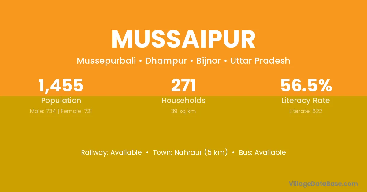 Nahraur (5 km) is the nearest town to Mussaipur village for major economic activities and is located approximately 5 km away.
