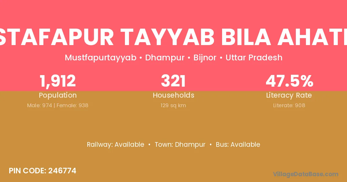 Mustafapur Tayyab Bila Ahatmal village has a total population of 1,912 people, of which 974 are males and 938 are females.
