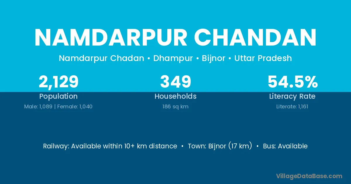 Bijnor (17 km) is the nearest town to Namdarpur Chandan village for major economic activities and is located approximately 17 km away.