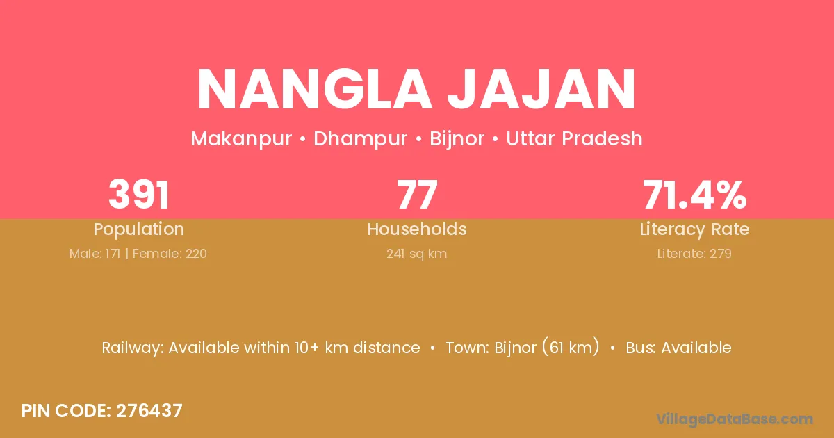 Bijnor (61 km) is the nearest town to Nangla Jajan village for major economic activities and is located approximately 61 km away.