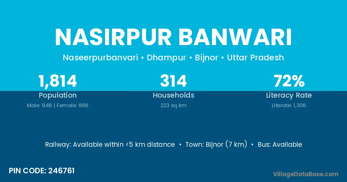 Bijnor (7 km) is the nearest town to Nasirpur Banwari village for major economic activities and is located approximately 7 km away.