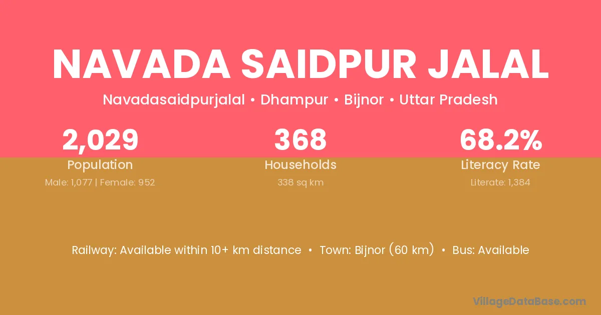 Bijnor (60 km) is the nearest town to Navada Saidpur Jalal village for major economic activities and is located approximately 60 km away.