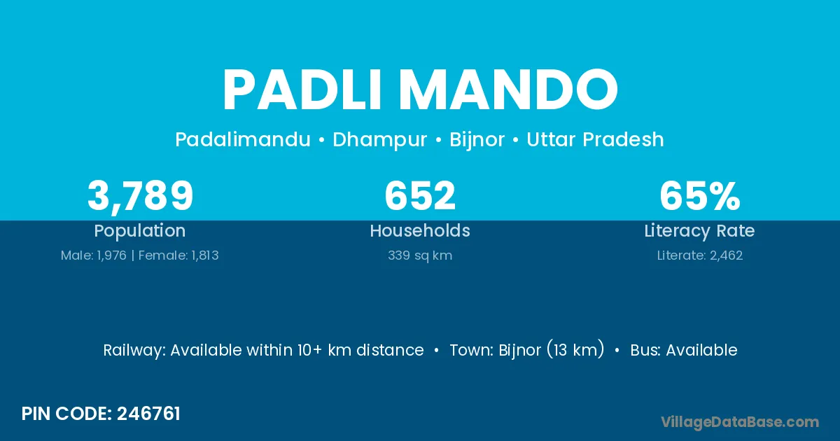 Bijnor (13 km) is the nearest town to Padli Mando village for major economic activities and is located approximately 13 km away.