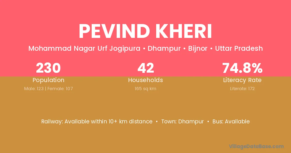 Pevind Kheri village has a total population of 230 people, of which 123 are males and 107 are females.