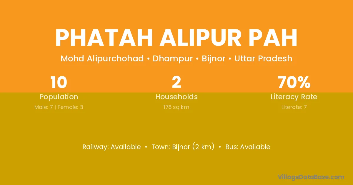Bijnor (2 km) is the nearest town to Phatah Alipur Pah village for major economic activities and is located approximately 2 km away.