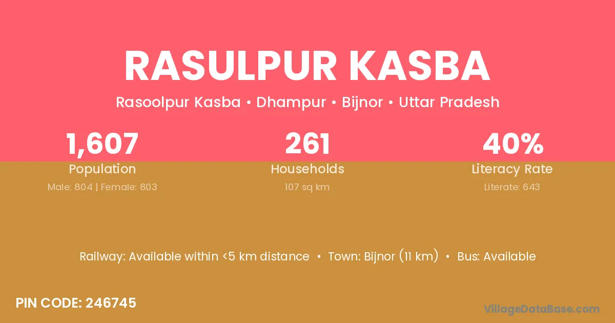 Bijnor (11 km) is the nearest town to Rasulpur Kasba village for major economic activities and is located approximately 11 km away.