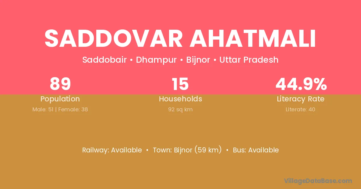 Bijnor (59 km) is the nearest town to Saddovar Ahatmali village for major economic activities and is located approximately 59 km away.