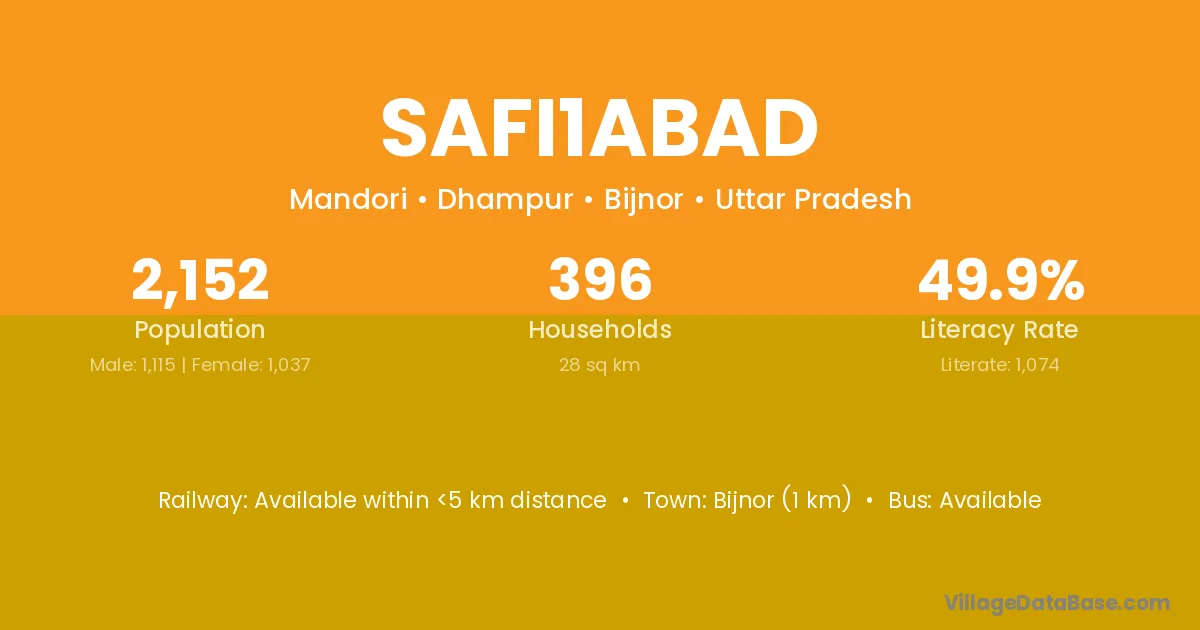 Bijnor (1 km) is the nearest town to Safi1abad village for major economic activities and is located approximately 1 km away.