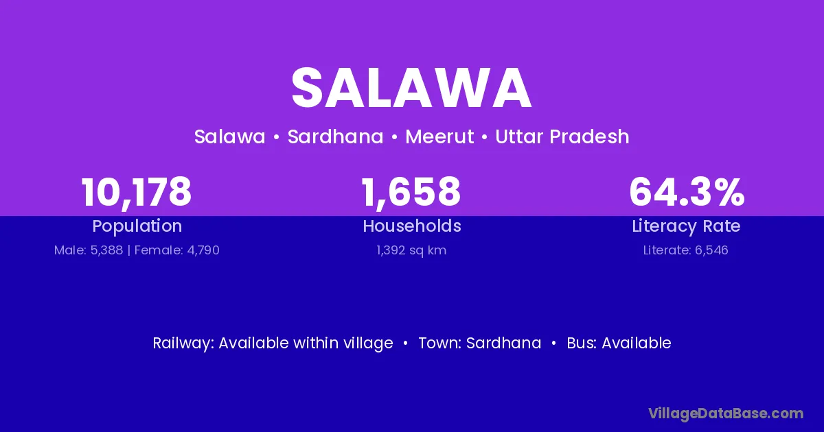 The literacy rate of Salawa village is 65.78%. Male literacy stands at 74.24% and female literacy at 55.86%.