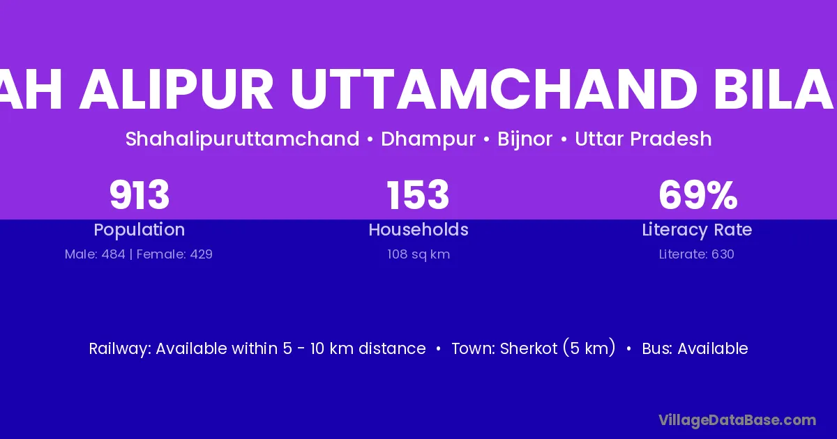 Sherkot (5 km) is the nearest town to Shah Alipur Uttamchand Bila Ah village for major economic activities and is located approximately 5 km away.