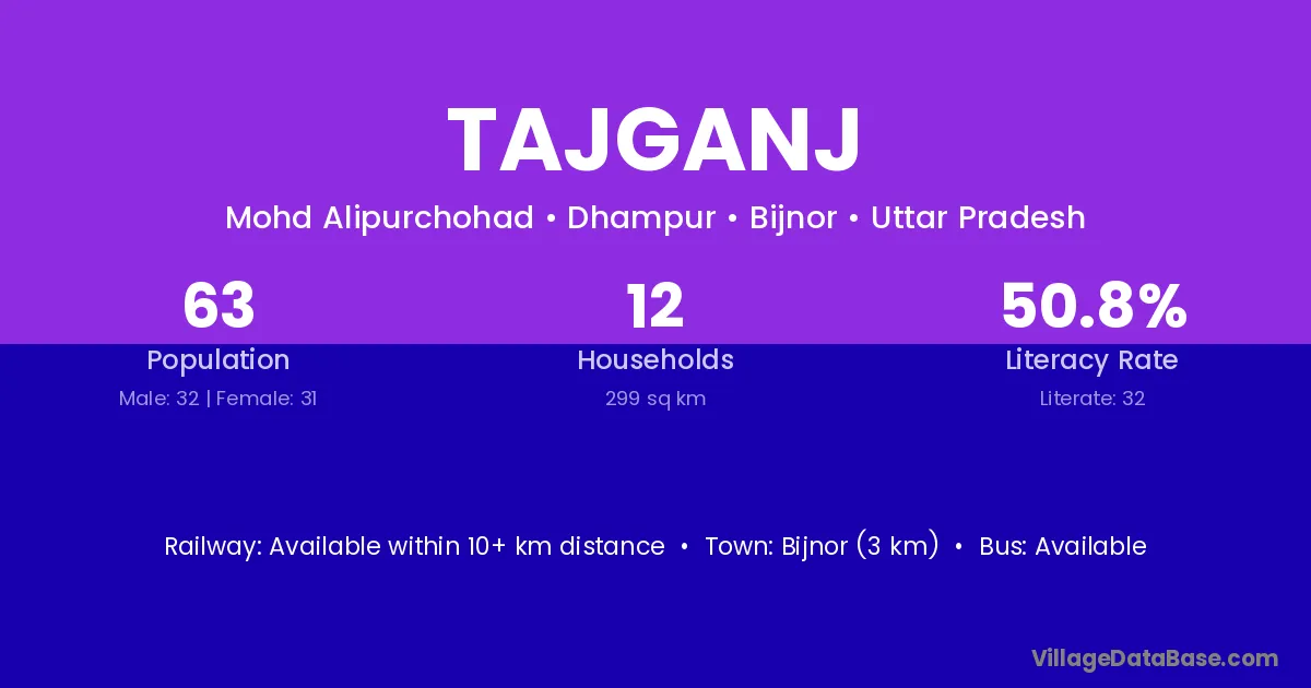 Bijnor (3 km) is the nearest town to Tajganj village for major economic activities and is located approximately 3 km away.