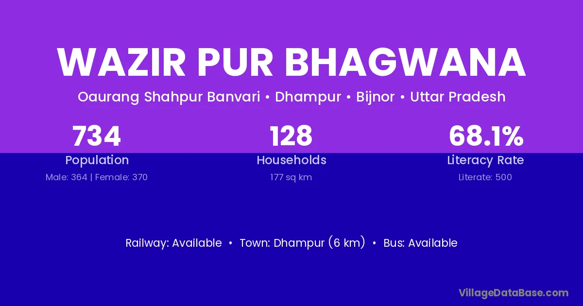 Dhampur (6 km) is the nearest town to Wazir Pur Bhagwana village for major economic activities and is located approximately 6 km away.