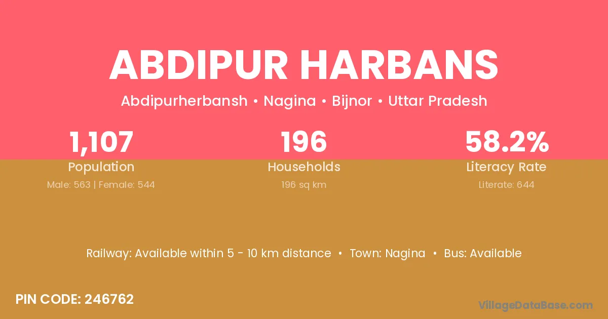 Abdipur Harbans village has a total population of 1,107 people, of which 563 are males and 544 are females.