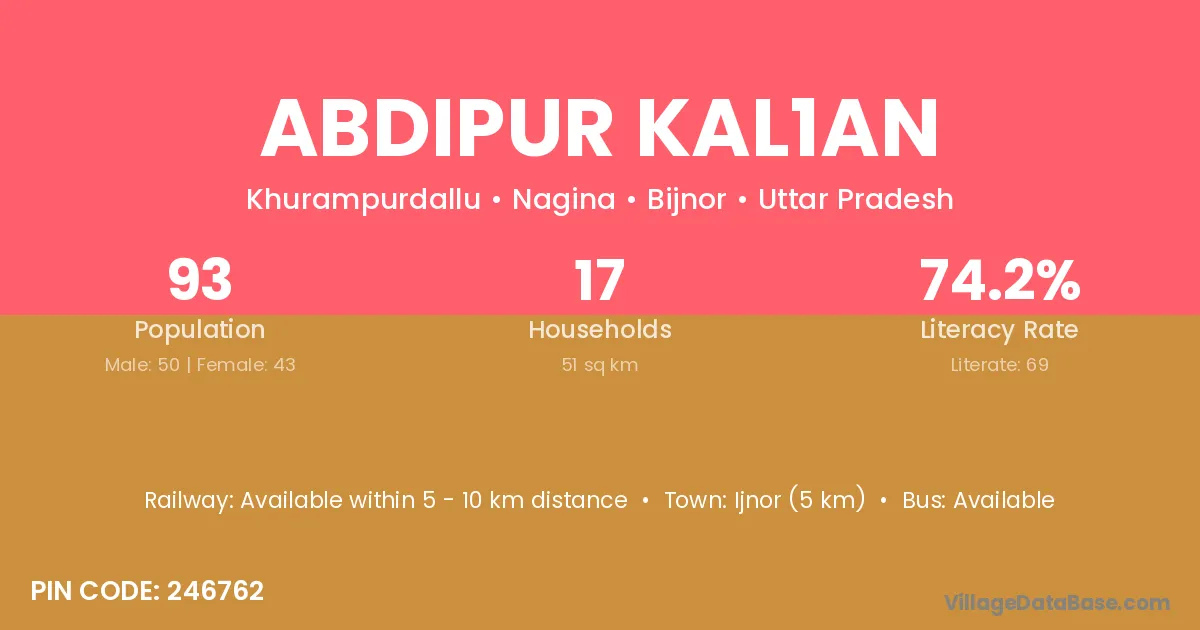 Ijnor (5 km) is the nearest town to Abdipur Kal1an village for major economic activities and is located approximately 5 km away.
