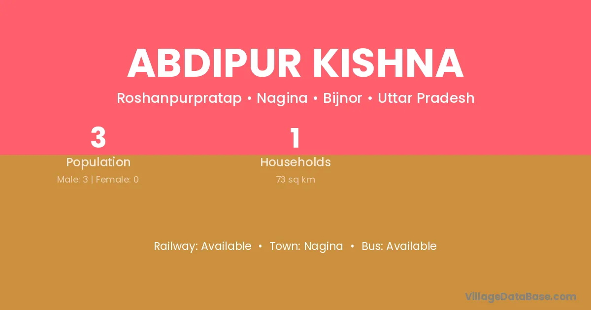Abdipur Kishna village has a total population of 3 people, of which 3 are males and 0 are females.