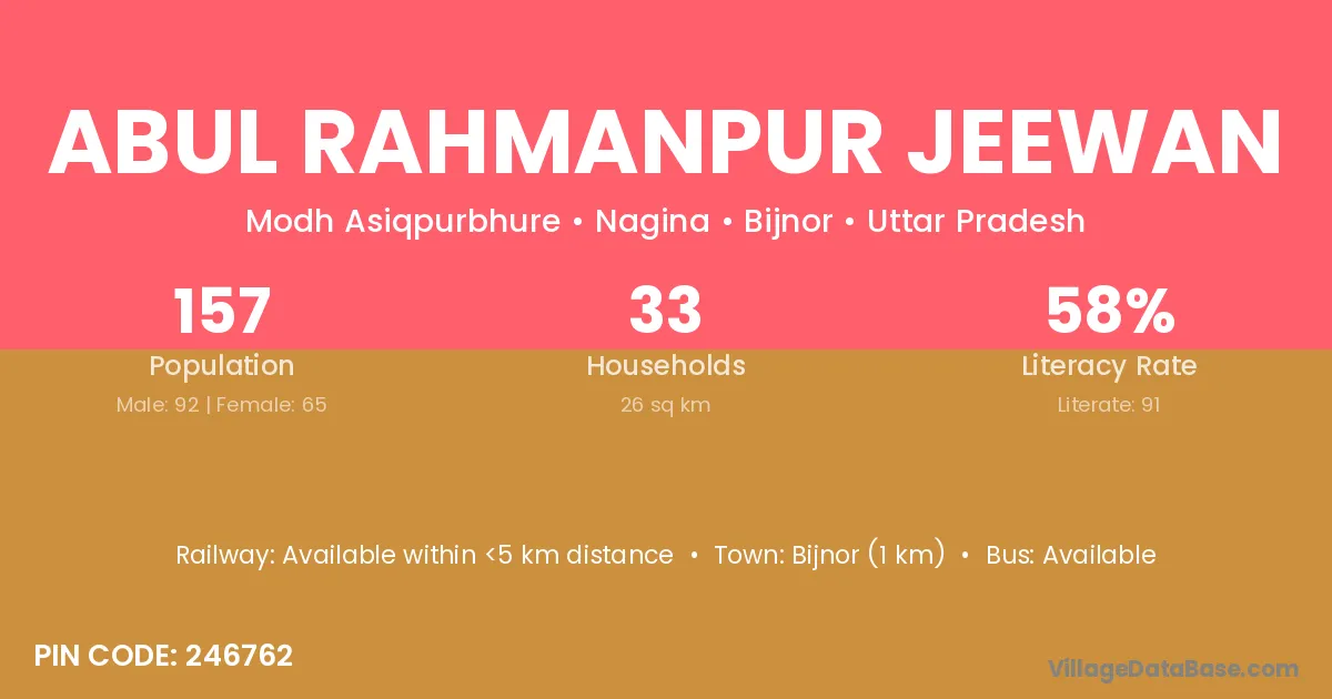 Abul Rahmanpur Jeewan village has a total population of 157 people, of which 92 are males and 65 are females.