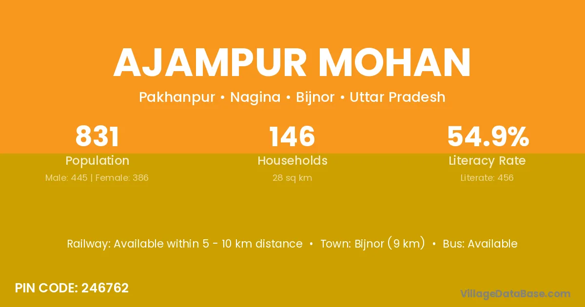 Bijnor (9 km) is the nearest town to Ajampur Mohan village for major economic activities and is located approximately 9 km away.