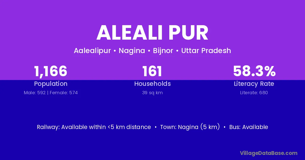 Nagina (5 km) is the nearest town to Aleali Pur village for major economic activities and is located approximately 5 km away.