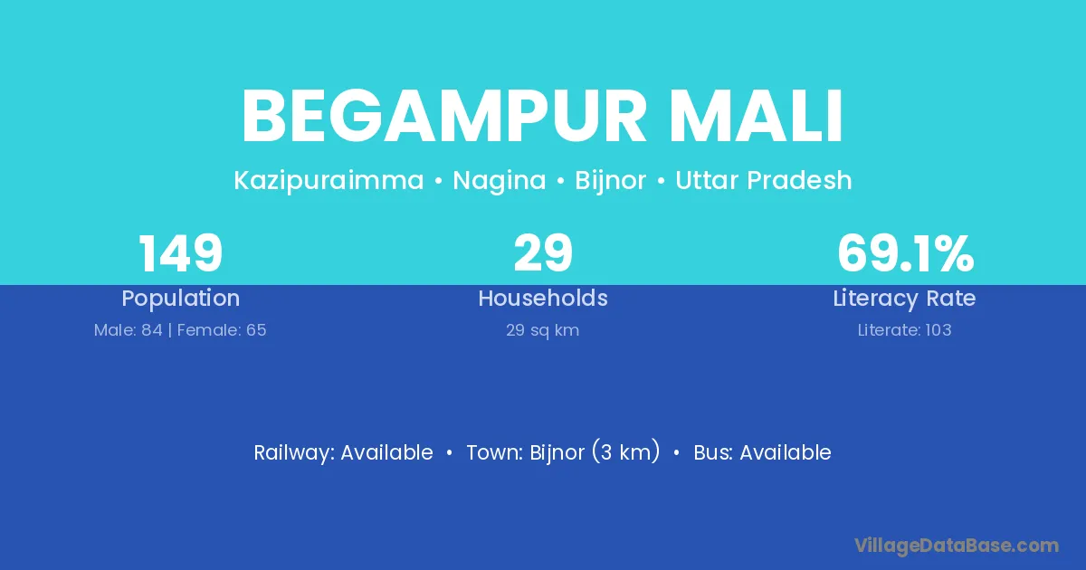 Bijnor (3 km) is the nearest town to Begampur Mali village for major economic activities and is located approximately 3 km away.