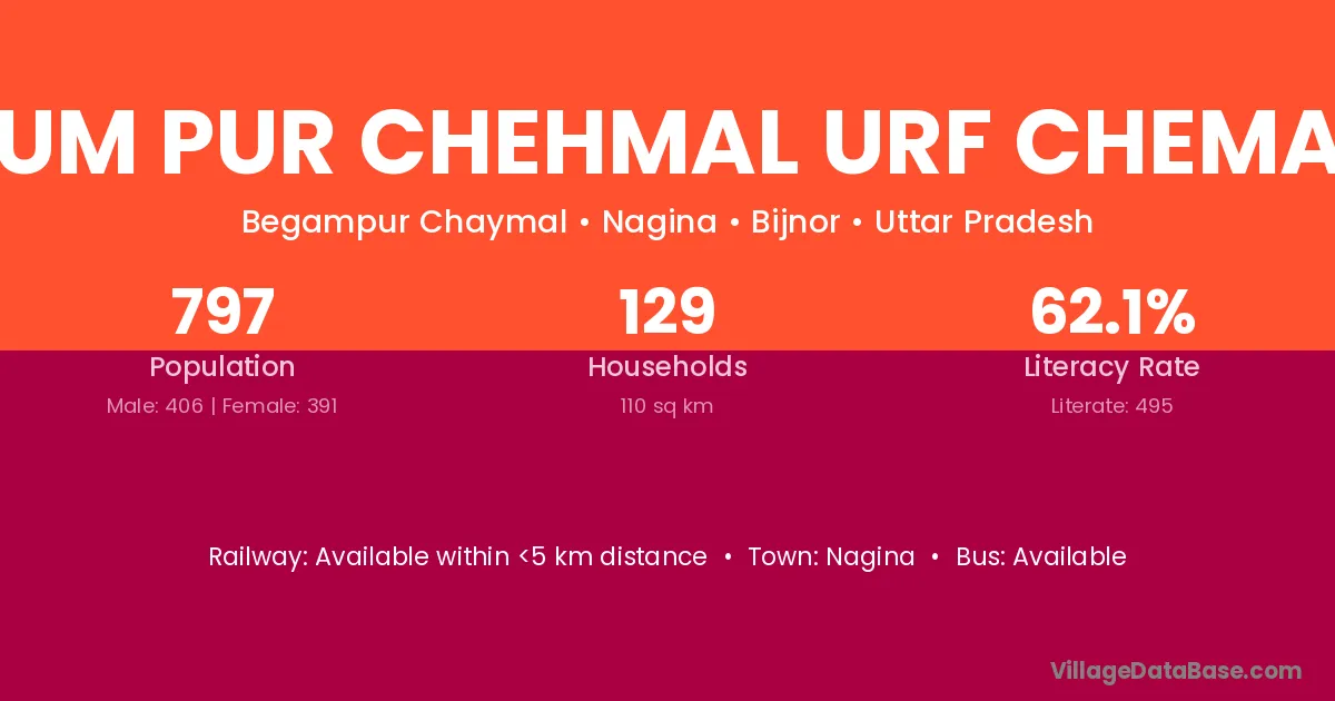 Begum Pur Chehmal Urf Chemaher village has a total population of 797 people, of which 406 are males and 391 are females.
