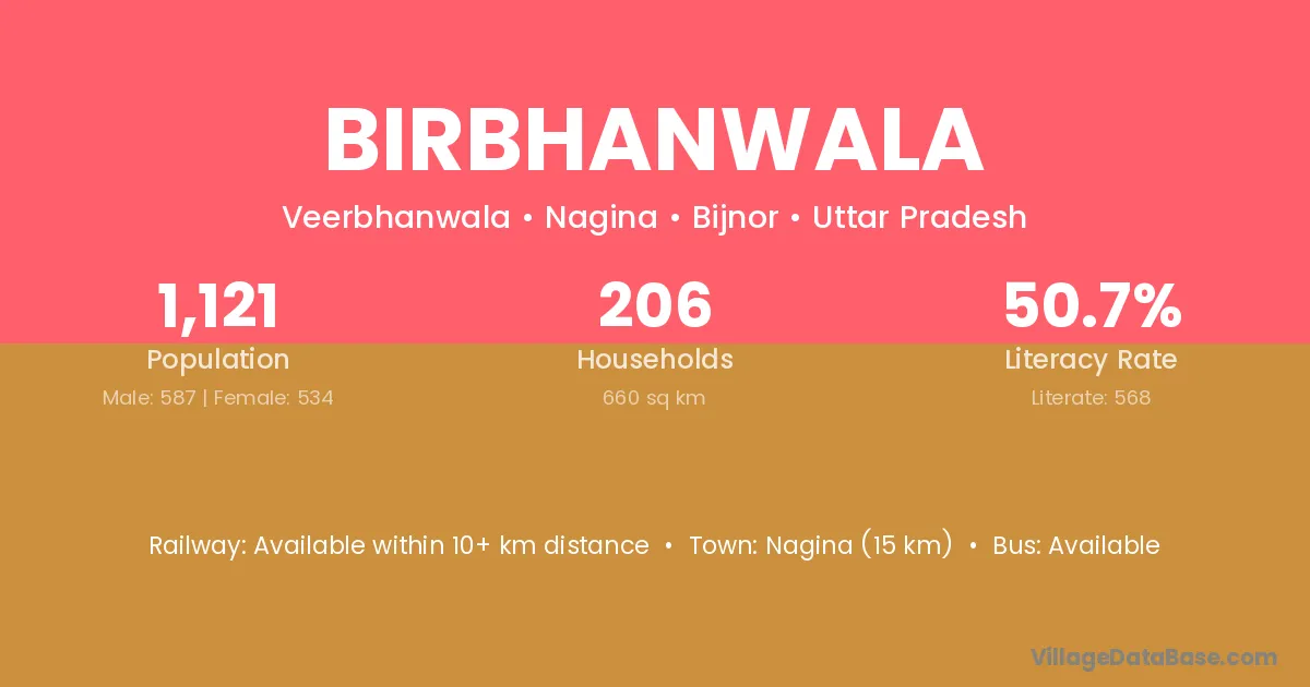 Nagina (15 km) is the nearest town to Birbhanwala village for major economic activities and is located approximately 15 km away.