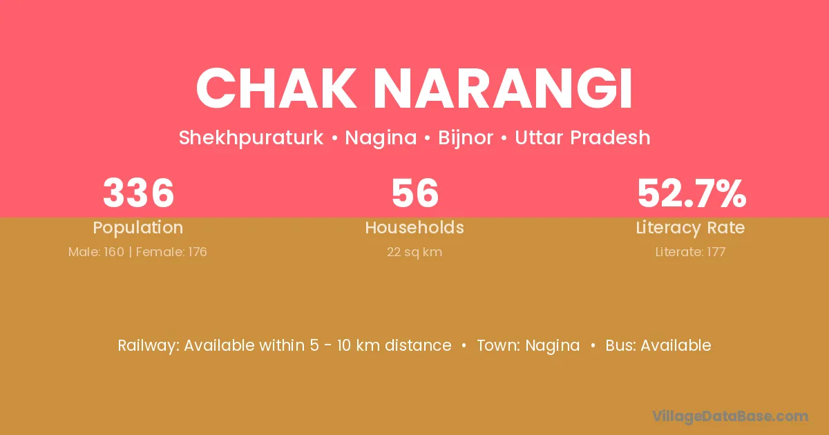 Chak Narangi village has a total population of 336 people, of which 160 are males and 176 are females.