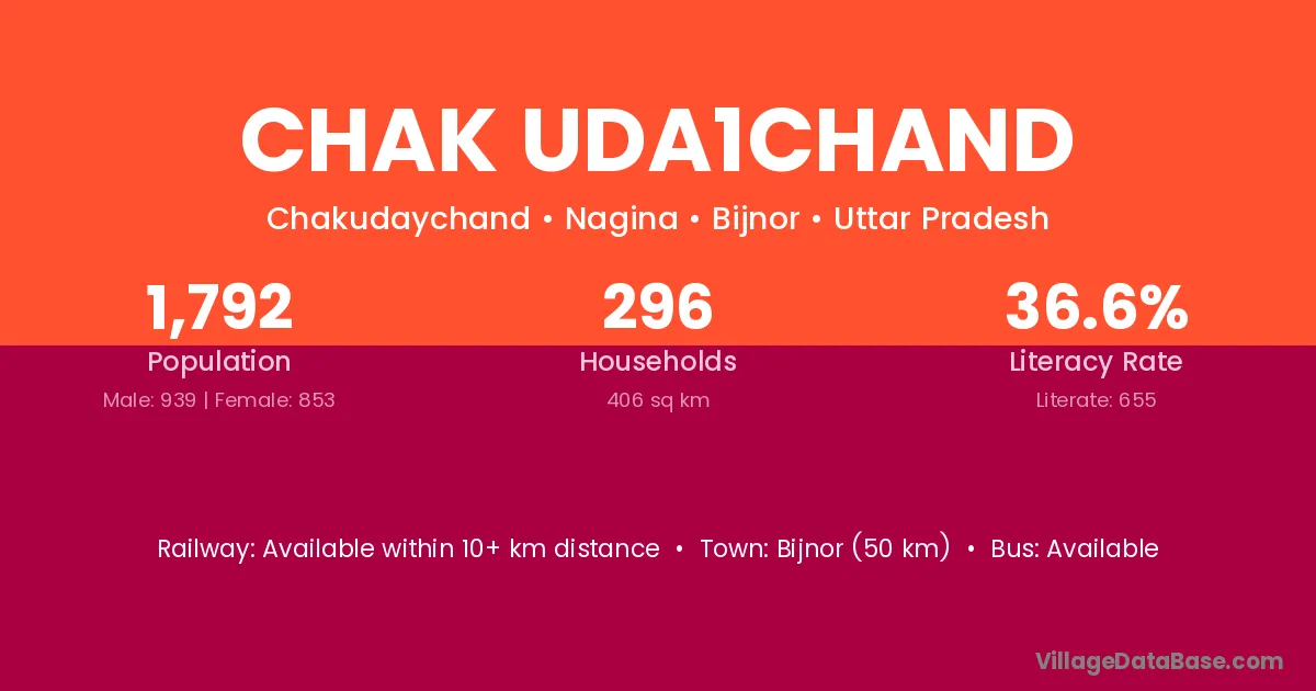 Bijnor (50 km) is the nearest town to Chak Uda1chand village for major economic activities and is located approximately 50 km away.