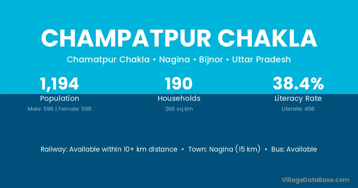 Nagina (15 km) is the nearest town to Champatpur Chakla village for major economic activities and is located approximately 15 km away.