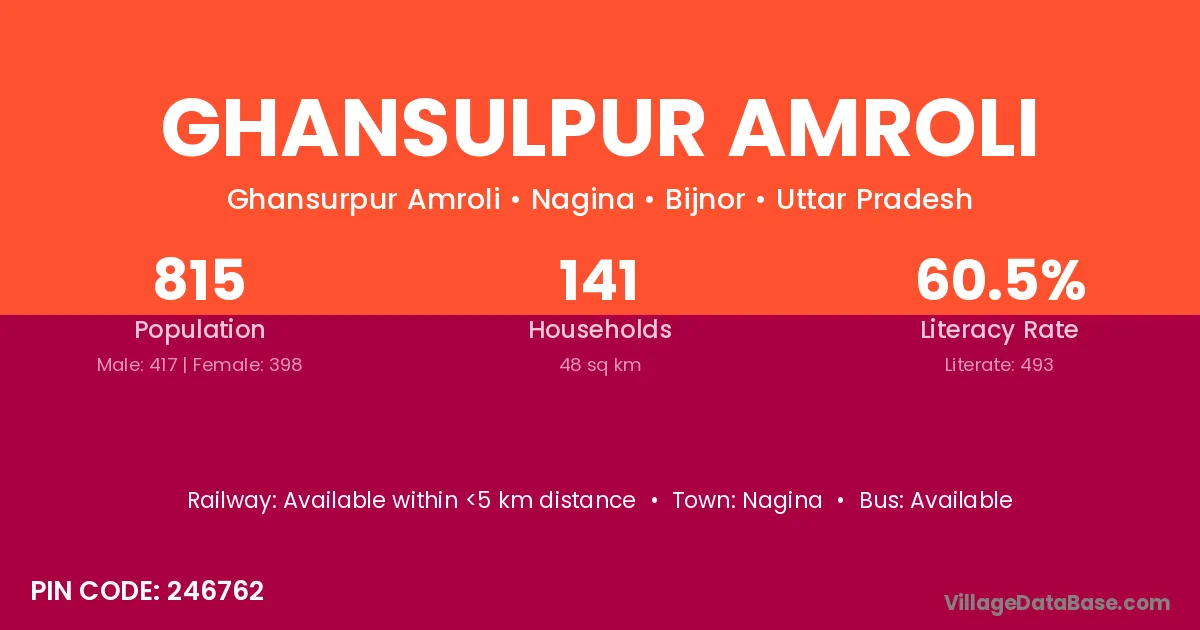 Ghansulpur Amroli village has a total population of 815 people, of which 417 are males and 398 are females.