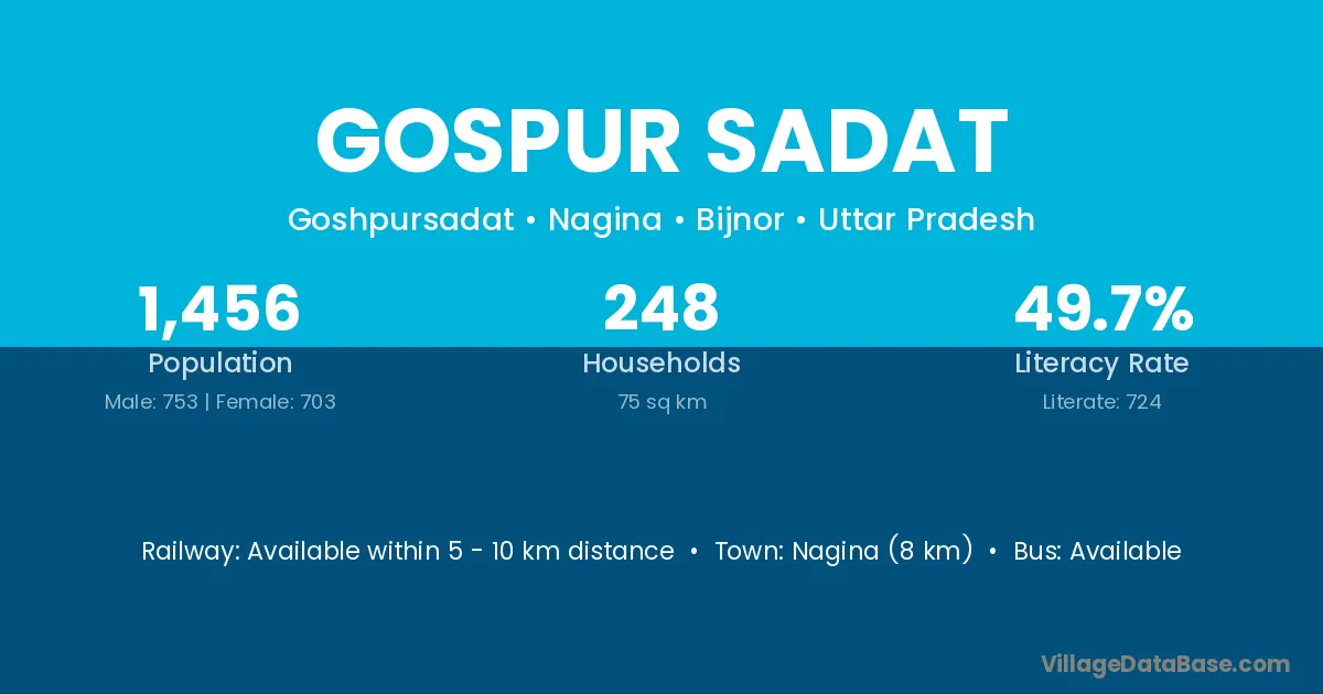 Nagina (8 km) is the nearest town to Gospur Sadat village for major economic activities and is located approximately 8 km away.