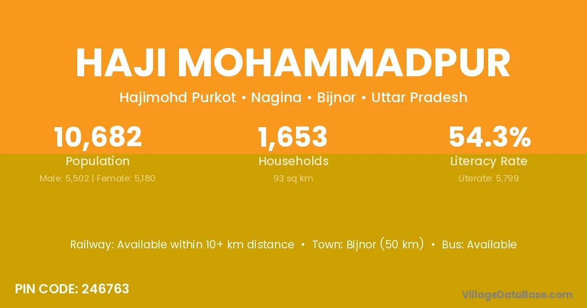 Bijnor (50 km) is the nearest town to Haji Mohammadpur village for major economic activities and is located approximately 50 km away.