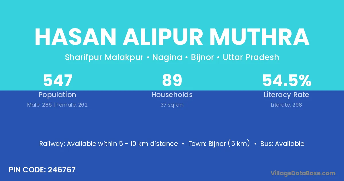 Bijnor (5 km) is the nearest town to Hasan Alipur Muthra village for major economic activities and is located approximately 5 km away.