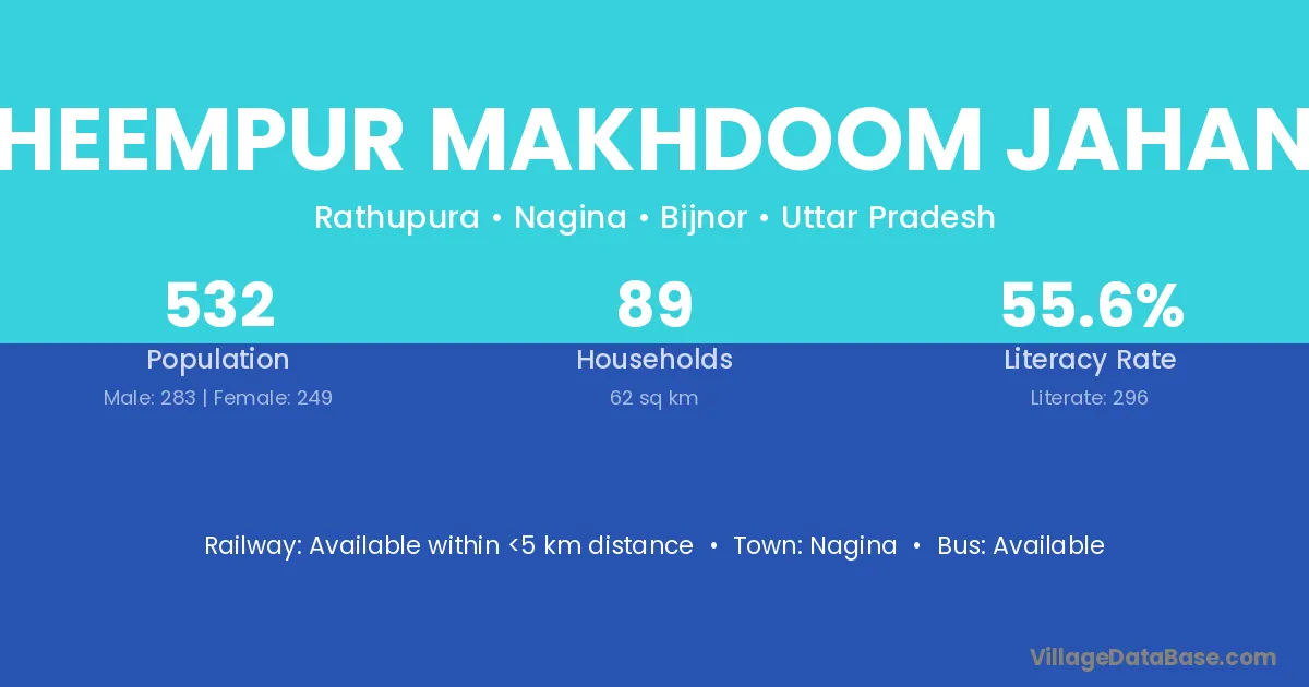 Heempur Makhdoom Jahan village has a total population of 532 people, of which 283 are males and 249 are females.