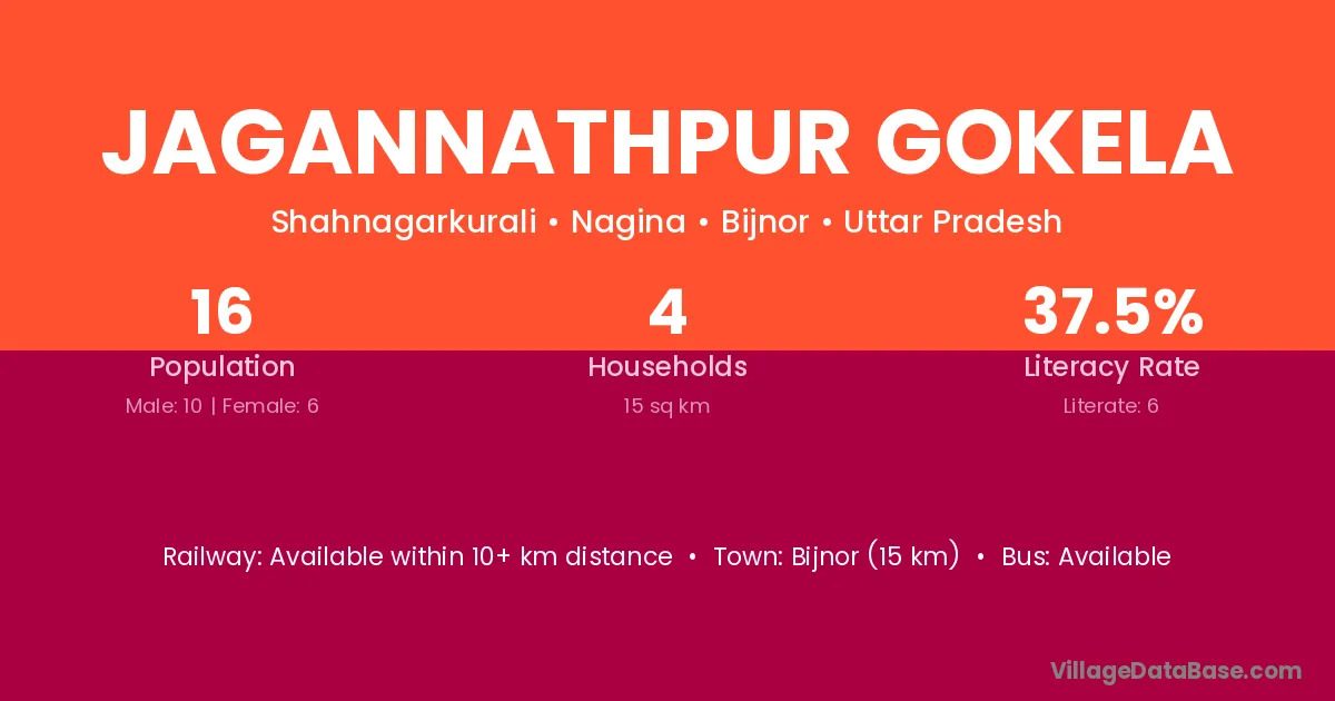 Jagannathpur Gokela village has a total population of 16 people, of which 10 are males and 6 are females.