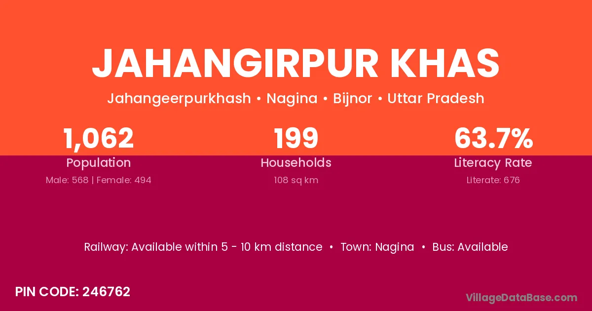 Jahangirpur Khas village has a total population of 1,062 people, of which 568 are males and 494 are females.