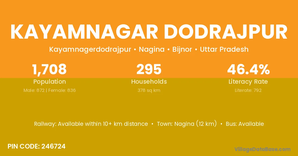 Nagina (12 km) is the nearest town to Kayamnagar Dodrajpur village for major economic activities and is located approximately 12 km away.
