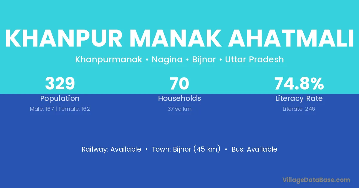Bijnor (45 km) is the nearest town to Khanpur Manak Ahatmali village for major economic activities and is located approximately 45 km away.