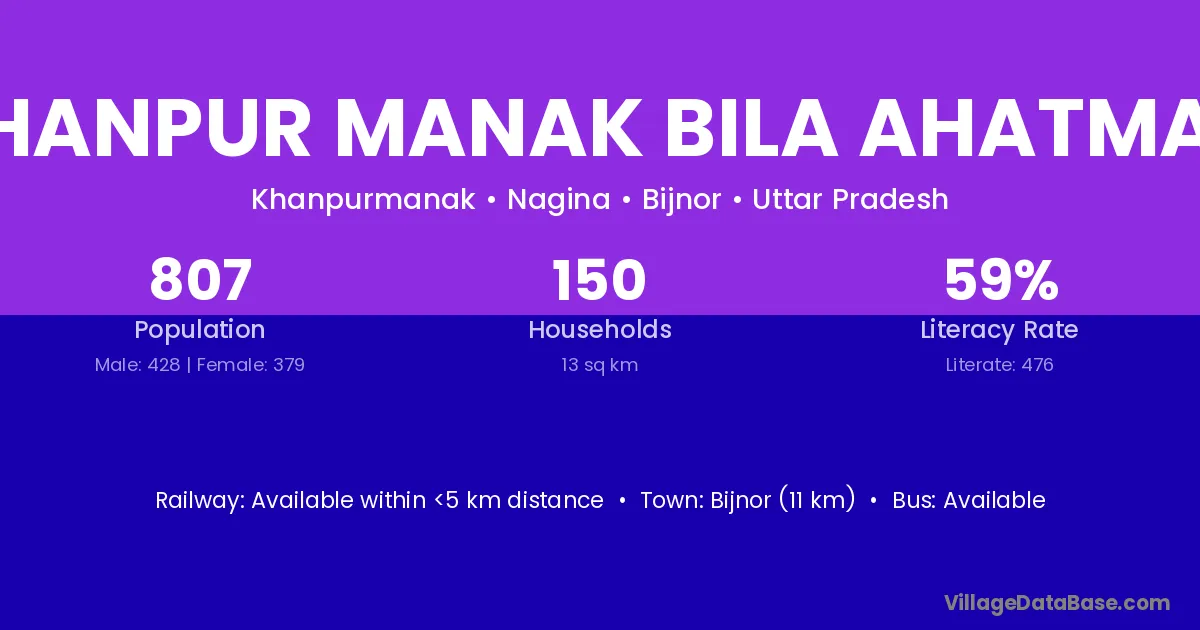 Khanpur Manak Bila Ahatmali village has a total population of 807 people, of which 428 are males and 379 are females.