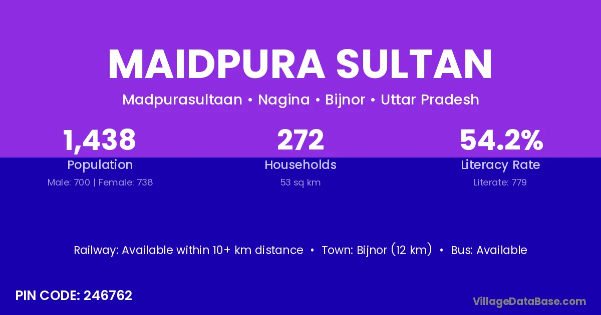 Bijnor (12 km) is the nearest town to Maidpura Sultan village for major economic activities and is located approximately 12 km away.