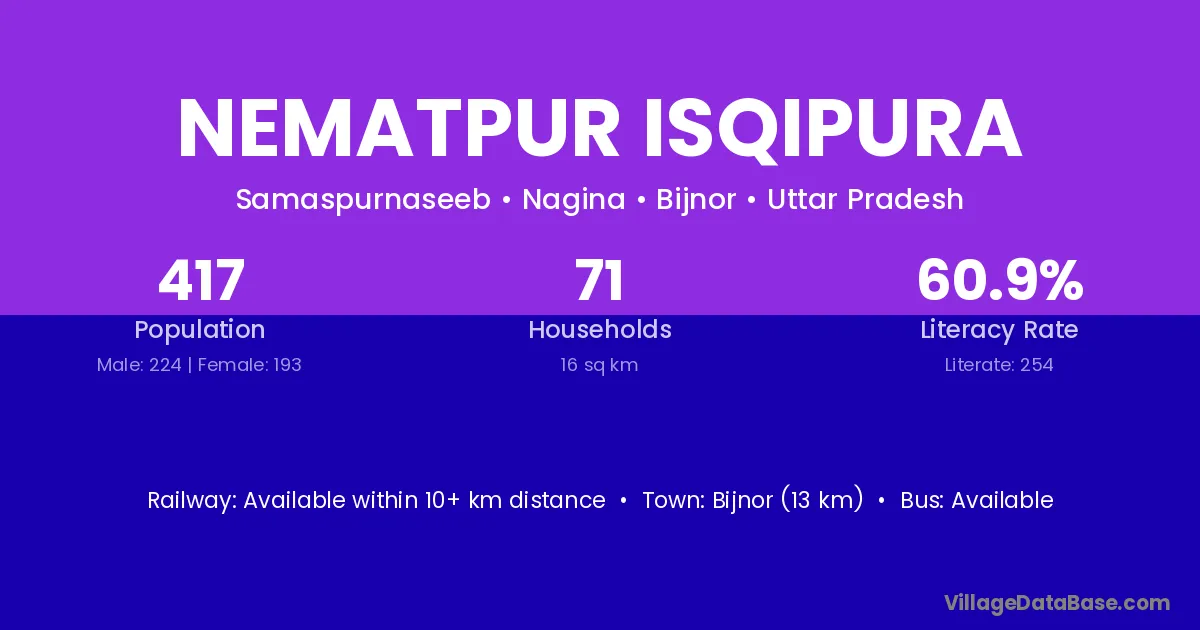 Nematpur Isqipura village has a total population of 417 people, of which 224 are males and 193 are females.