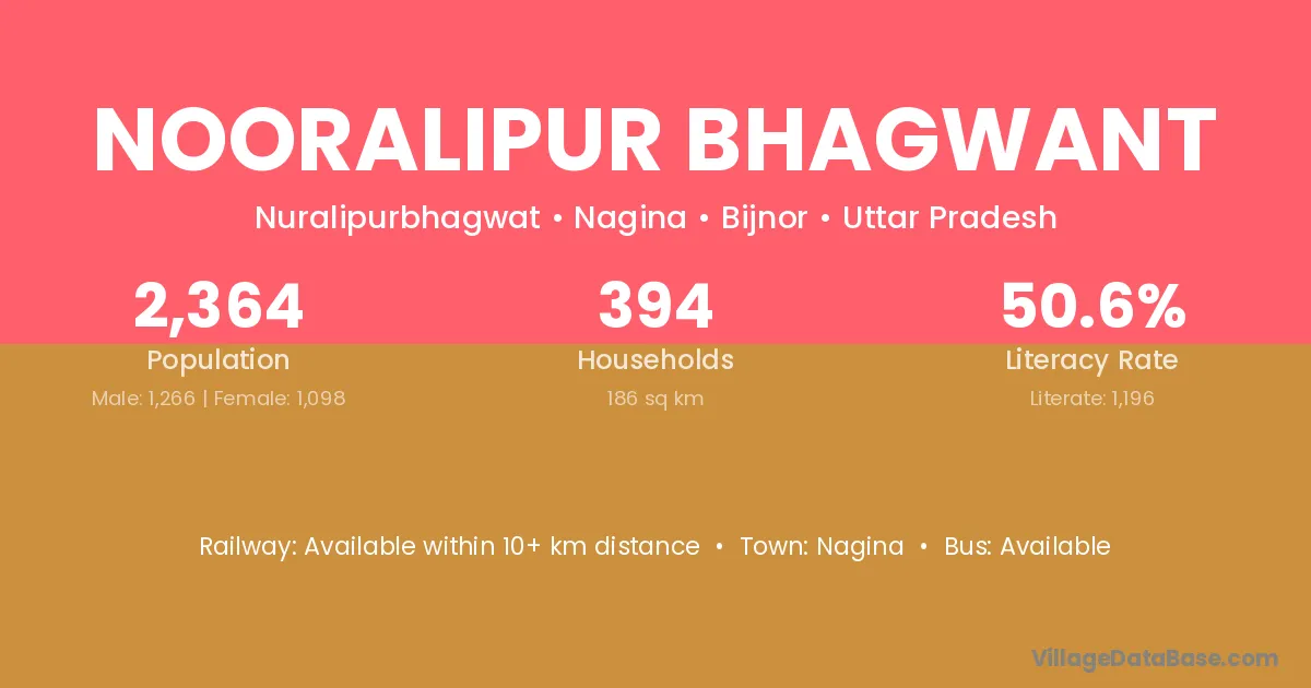 Nooralipur Bhagwant village has a total population of 2,364 people, of which 1,266 are males and 1,098 are females.