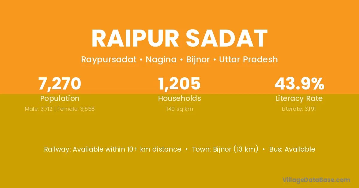 Bijnor (13 km) is the nearest town to Raipur Sadat village for major economic activities and is located approximately 13 km away.